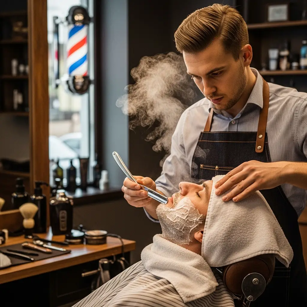 Ritual de barbería con toalla caliente, crema especial y navaja tradicional para un acabado perfecto.