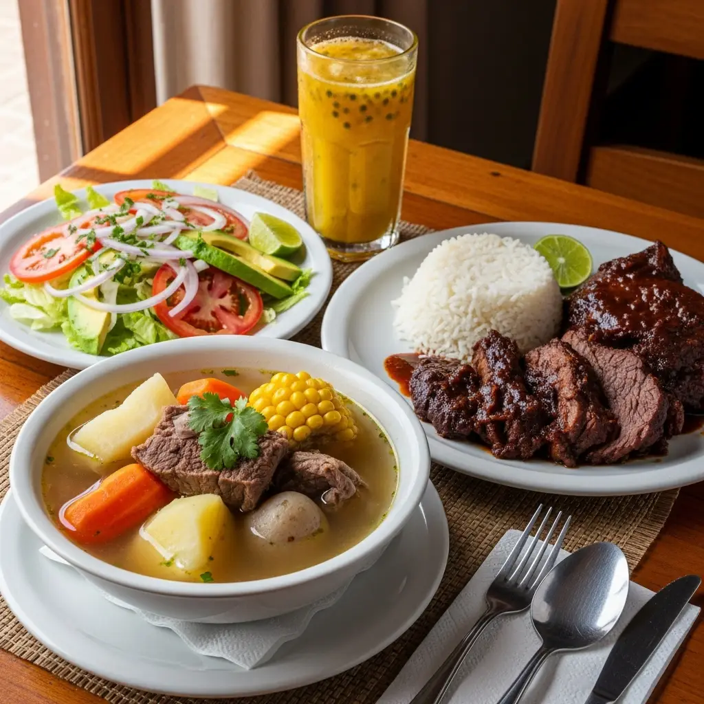 Menú diario de comida casera venezolana con sopa, plato principal, ensalada, arroz y bebida incluida.